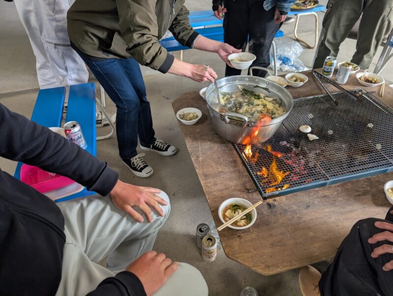 そして、作業の後は待ちに待った慰労会!新入社員の紹介が行われた後、組合長の元気な乾杯の音頭で賑やかにスタートしました。今回のメインメニューは、みんな大好きな焼肉!……ですが、それ以上に注目を集めたのが、社員さんが腕を振るってくれた特製の「もつ鍋」です。